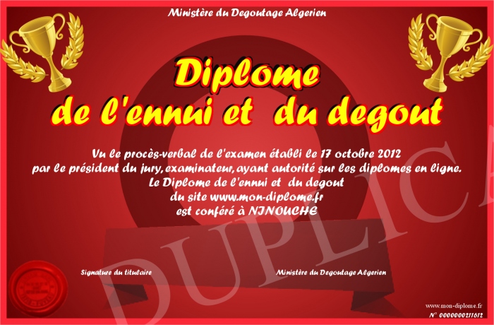 Envoyez par email votre Diplome de l'ennui et du degout personalisé