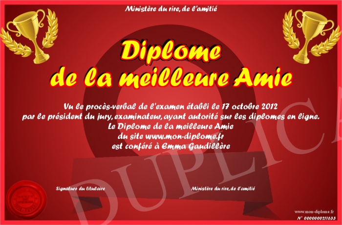 Envoyez par email votre Diplome de la meilleure Amie personalisé