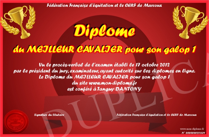 Envoyez par email votre Diplôme du MEILLEUR CAVALIER pour son galop 1 personalisé