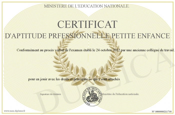 Envoyez par email votre CERTIFICAT D'APTITUDE PRFESSIONNELLE Petite Enfance personalisé