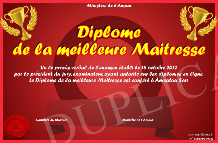 Envoyez par email votre Diplome de la meilleure Maitresse personalisé