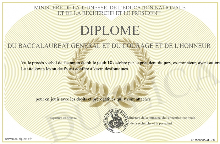 Envoyez par email votre Diplôme du baccalaureat général et du courage et de l'honneur personalisé