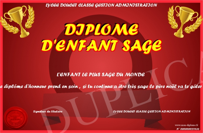 Envoyez par email votre DIPLOME D'ENFANT SAGE personalisé