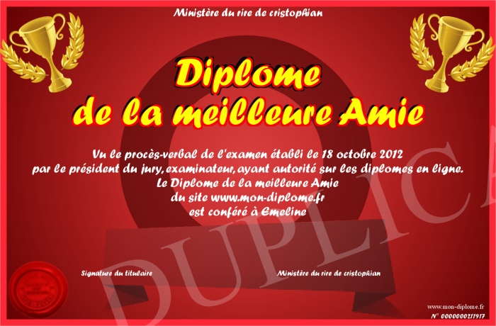 Envoyez par email votre Diplome de la meilleure Amie personalisé