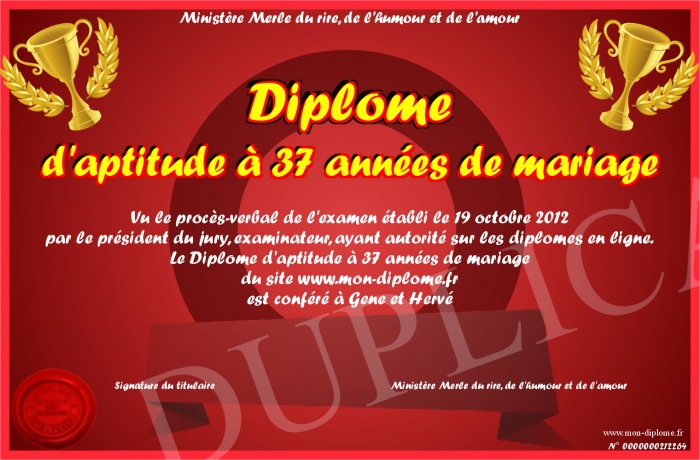 Envoyez par email votre Diplome d'aptitude à 37 années de mariage personalisé