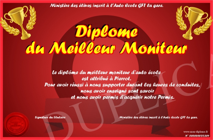 Envoyez par email votre Diplôme du Meilleur Moniteur personalisé