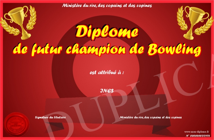Envoyez par email votre Diplome de futur champion de Bowling personalisé