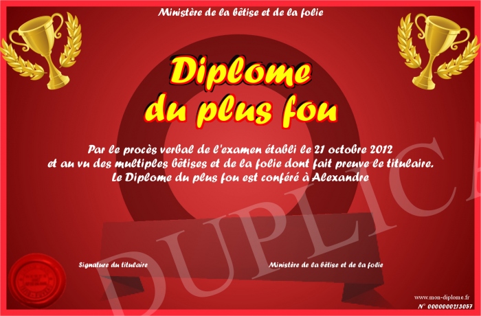 Envoyez par email votre Diplôme du plus fou personalisé