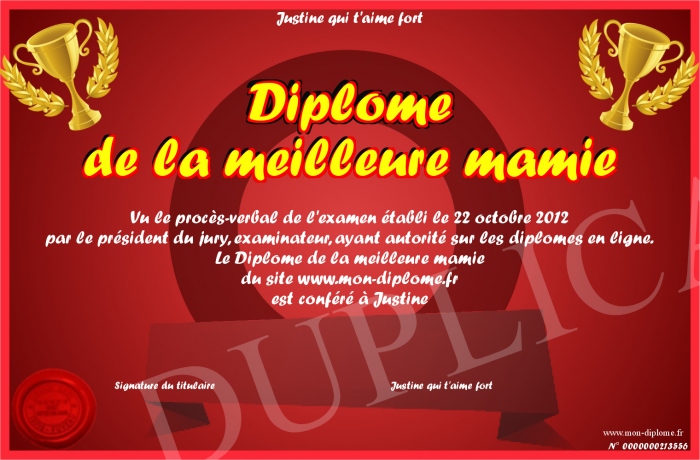 Envoyez par email votre Diplôme de la meilleure mamie personalisé