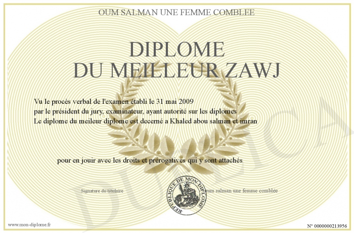 Envoyez par email votre Diplôme du meilleur zawj personalisé