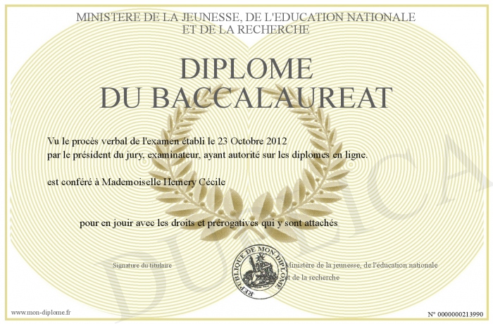 Envoyez par email votre Diplome du baccalaureat personalisé