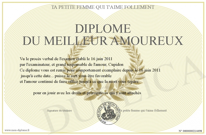 Envoyez par email votre Diplôme du meilleur amoureux personalisé