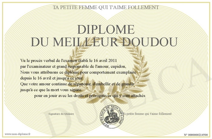 Envoyez par email votre Diplôme du meilleur doudou personalisé