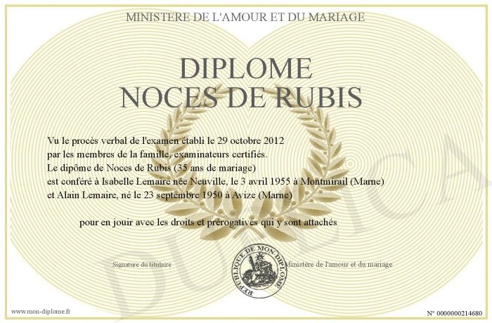 Envoyez par email votre Diplôme Noces de Rubis personalisé