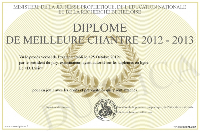 Envoyez par email votre Diplôme de meilleure CHANTRE 2012 - 2013 personalisé