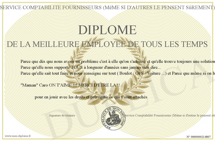 Envoyez par email votre Diplôme de la Meilleure Employée de tous les TEMPS personalisé