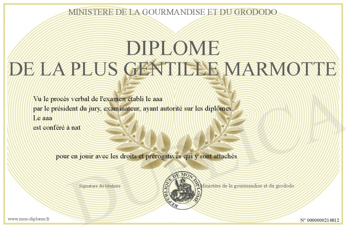 Envoyez par email votre Diplôme de la plus gentille marmotte personalisé