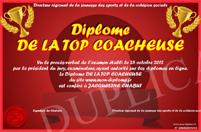 Envoyez par email votre Diplôme DE LA TOP COACHEUSE personalisé