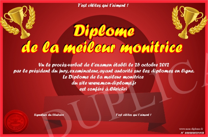 Envoyez par email votre Diplôme de la meileur monitrice personalisé