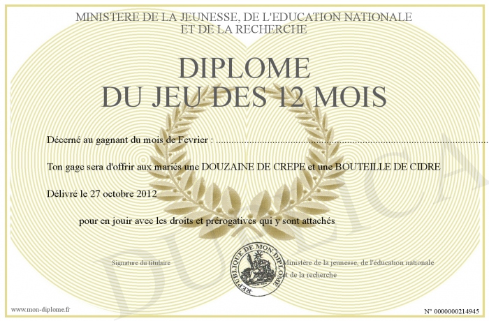 Envoyez par email votre Diplôme du Jeu des 12 mois personalisé