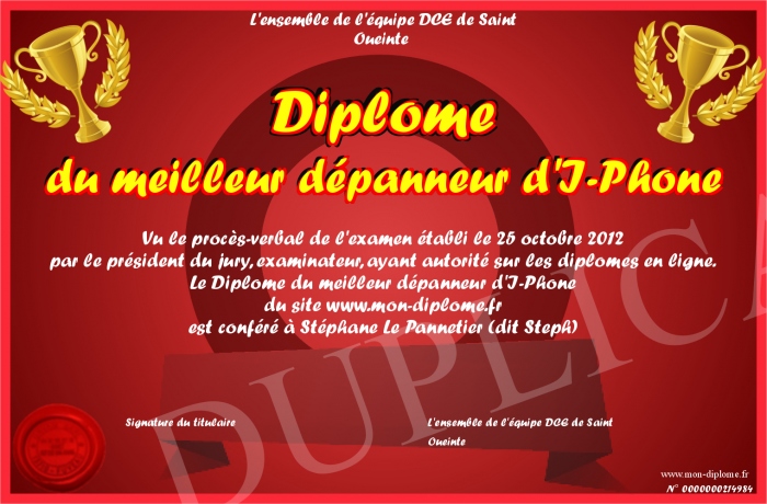 Envoyez par email votre Diplôme du meilleur dépanneur d'I-Phone personalisé