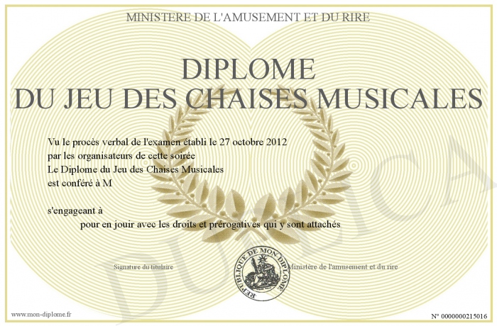 Envoyez par email votre Diplôme du Jeu des Chaises Musicales personalisé
