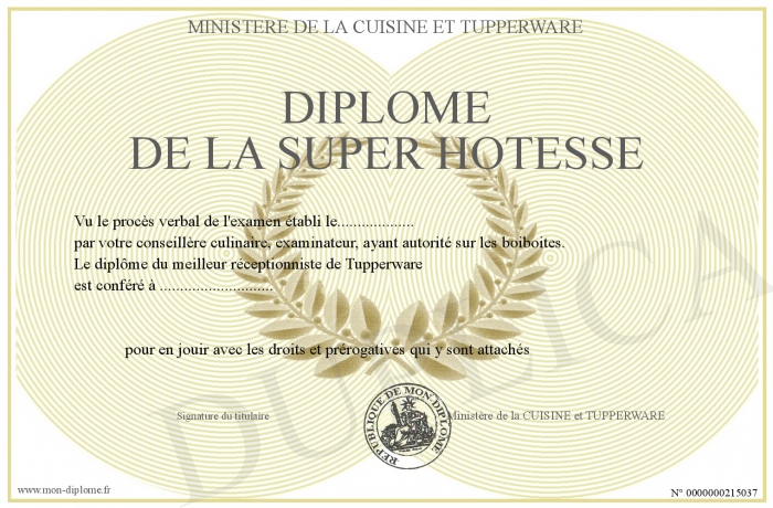 Envoyez par email votre Diplôme de la super hotesse personalisé