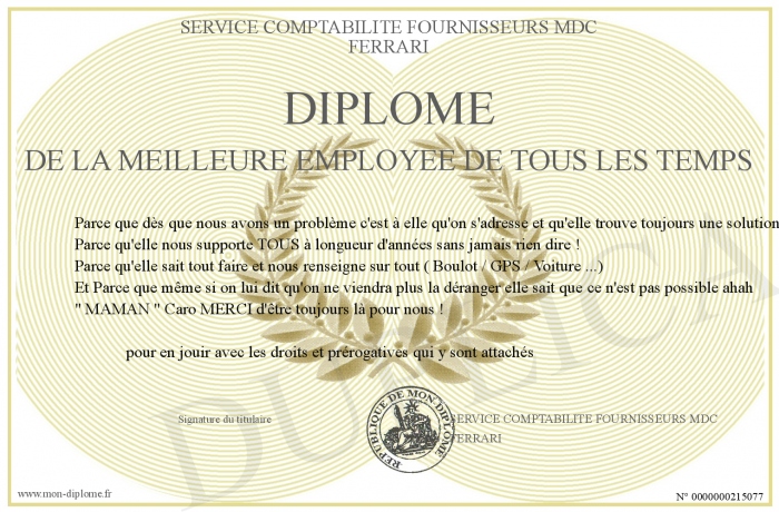 Envoyez par email votre Diplôme de la MEILLEURE Employée de tous les TEMPS personalisé