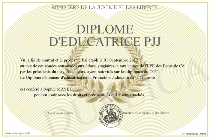 Envoyez par email votre Diplôme d'éducatrice PJJ personalisé