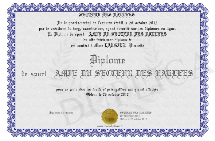 Envoyez par email votre Diplome de sport AMIE DU SECTEUR DES VALLEES personalisé