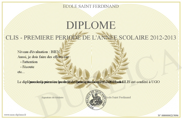 Envoyez par email votre Diplôme CLIS - Première pèriode de l'année scolaire 2012-2013 personalisé