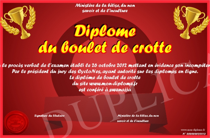 Envoyez par email votre Diplôme du boulet de crotte personalisé