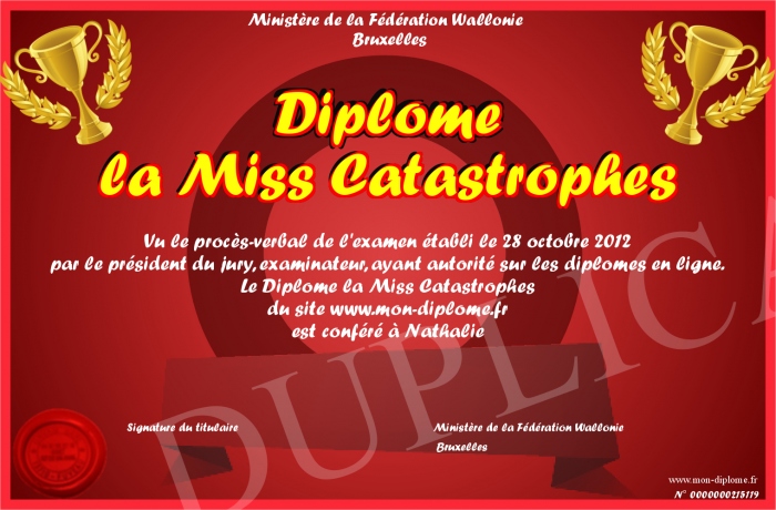 Envoyez par email votre Diplôme la Miss Catastrophes personalisé