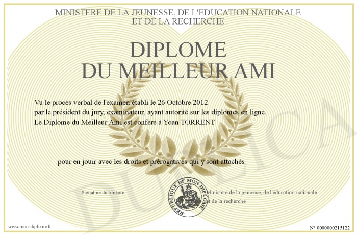 Envoyez par email votre Diplôme du Meilleur Ami personalisé