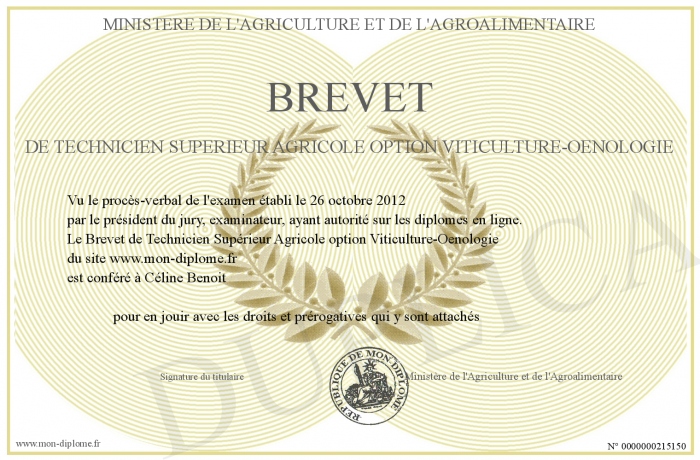 Envoyez par email votre Brevet de Technicien Supérieur Agricole option Viticulture-Oenologie personalisé