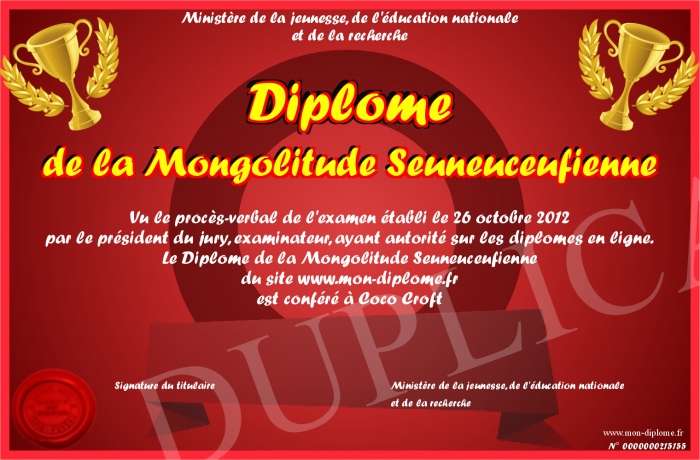 Envoyez par email votre Diplôme de la Mongolitude Seuneuceufienne personalisé