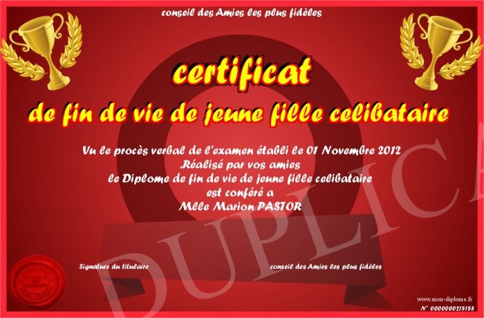 Envoyez par email votre certificat de fin de vie de jeune fille celibataire personalisé