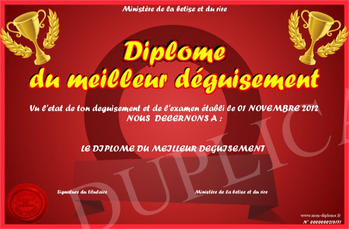 Envoyez par email votre Diplôme du meilleur déguisement personalisé