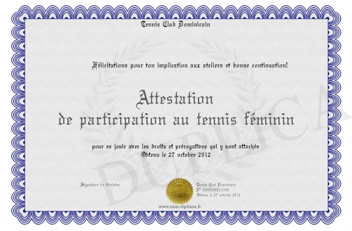 Envoyez par email votre Attestation de participation au tennis féminin personalisé