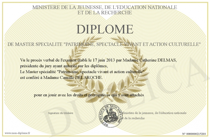 Envoyez par email votre Diplôme de Master spécialité -Patrimoine, spectacle vivant et action culturelle- personalisé