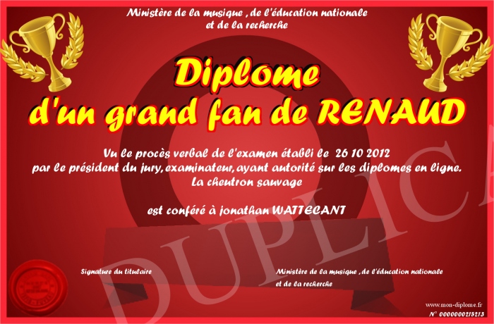 Envoyez par email votre Diplôme d'un grand fan de RENAUD personalisé