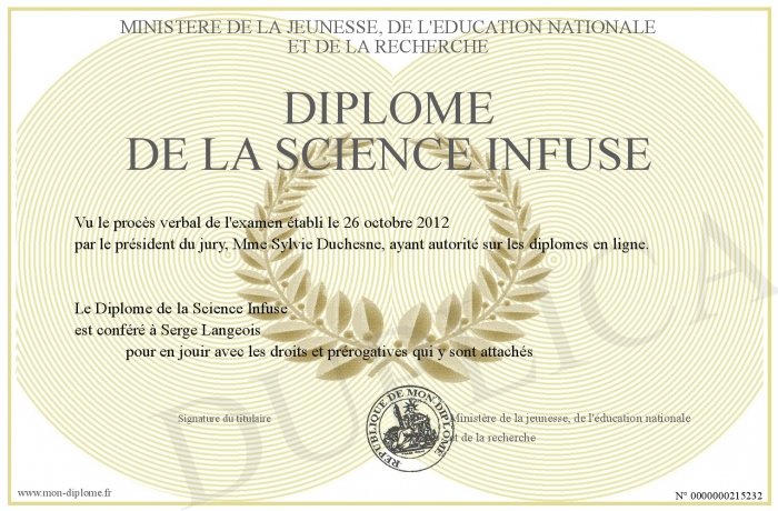 Envoyez par email votre Diplôme de la Science Infuse personalisé