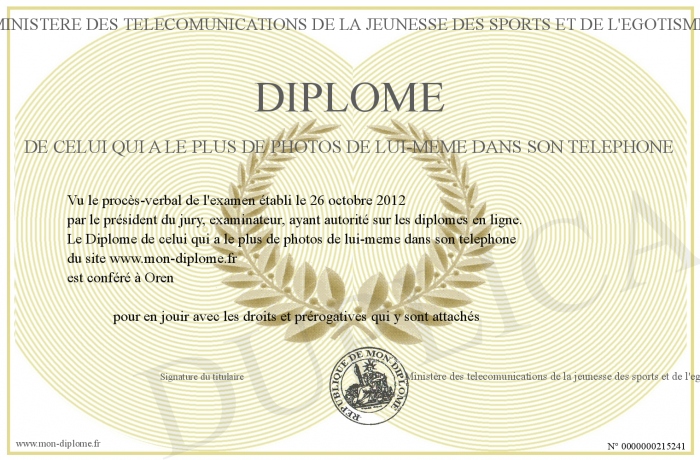Envoyez par email votre Diplome de celui qui a le plus de photos de lui-meme dans son telephone personalisé