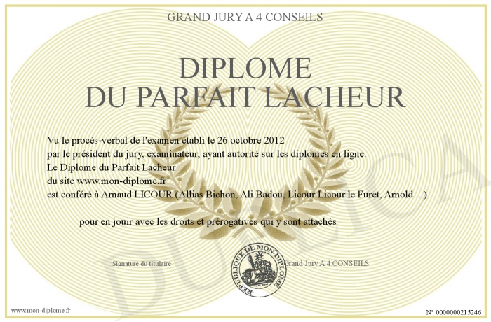 Envoyez par email votre Diplôme du Parfait Lacheur personalisé