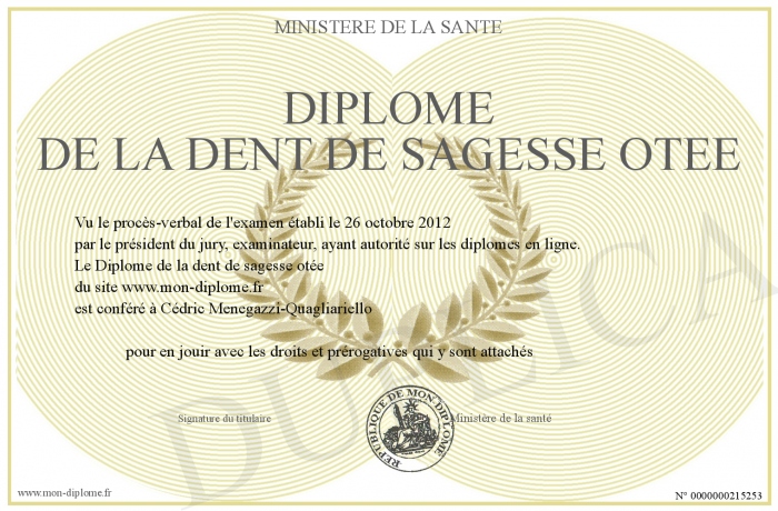 Envoyez par email votre Diplôme de la dent de sagesse ôtée personalisé