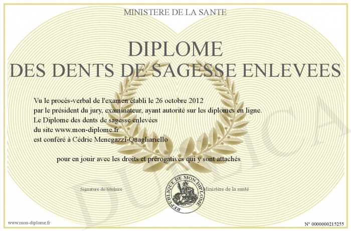 Envoyez par email votre Diplôme des dents de sagesse enlevées personalisé