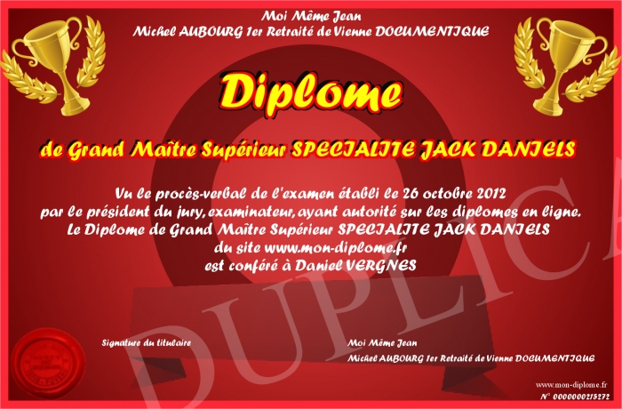 Envoyez par email votre Diplôme de Grand Maître Supérieur SPECIALITE JACK DANIELS personalisé