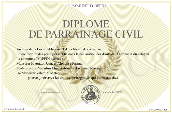 Envoyez par email votre Diplome de Parrainage Civil personalisé