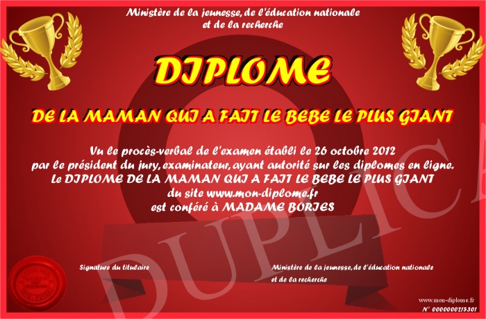 Envoyez par email votre DIPLOME DE LA MAMAN QUI A FAIT LE BEBE LE PLUS GIANT personalisé