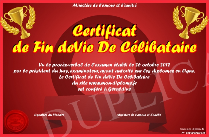 Envoyez par email votre Certificat de Fin deVie De Célibataire personalisé